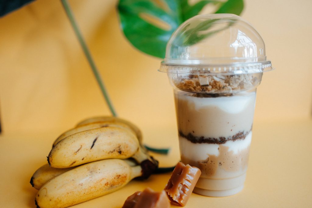 Banan, kokosnøttyoghurt, peanøtter, mandelmelkmørk sjokolade*, daddelsirup, kokosgranola* (Fit Cake), himalayasalt, søtningsmiddel: erythrol.